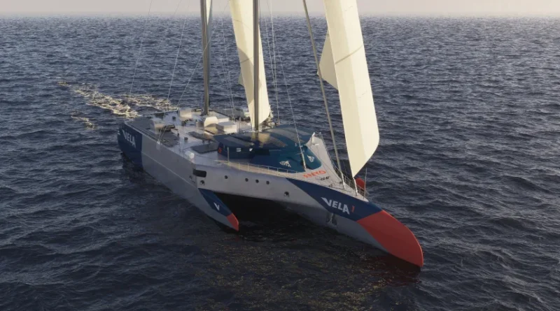The trimaran, with two smaller hulls on either side of a central hull, will be propelled by sails extending 200 feet (61 meters) above the waterline, with onboard power for living and working quarters, plus temperature-controlled cargo holds, provided by solar panels and two hydro generators. Vela says it will travel at an average speed of 14 knots — equivalent to the speed of a modern container ship — between New Jersey and Normandy or Bordeaux, France.